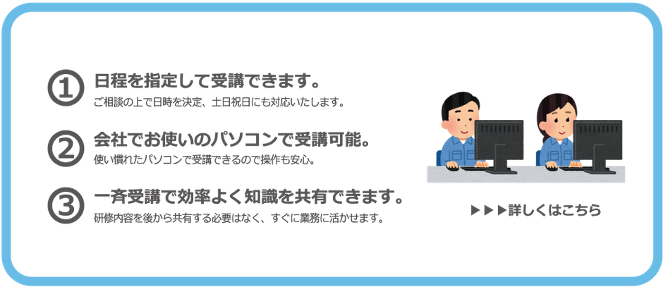 お使いの図面を教材に、普段と同じパソコン環境で受講が可能です。実務に即日活かせる研修内容をご提案いたします。